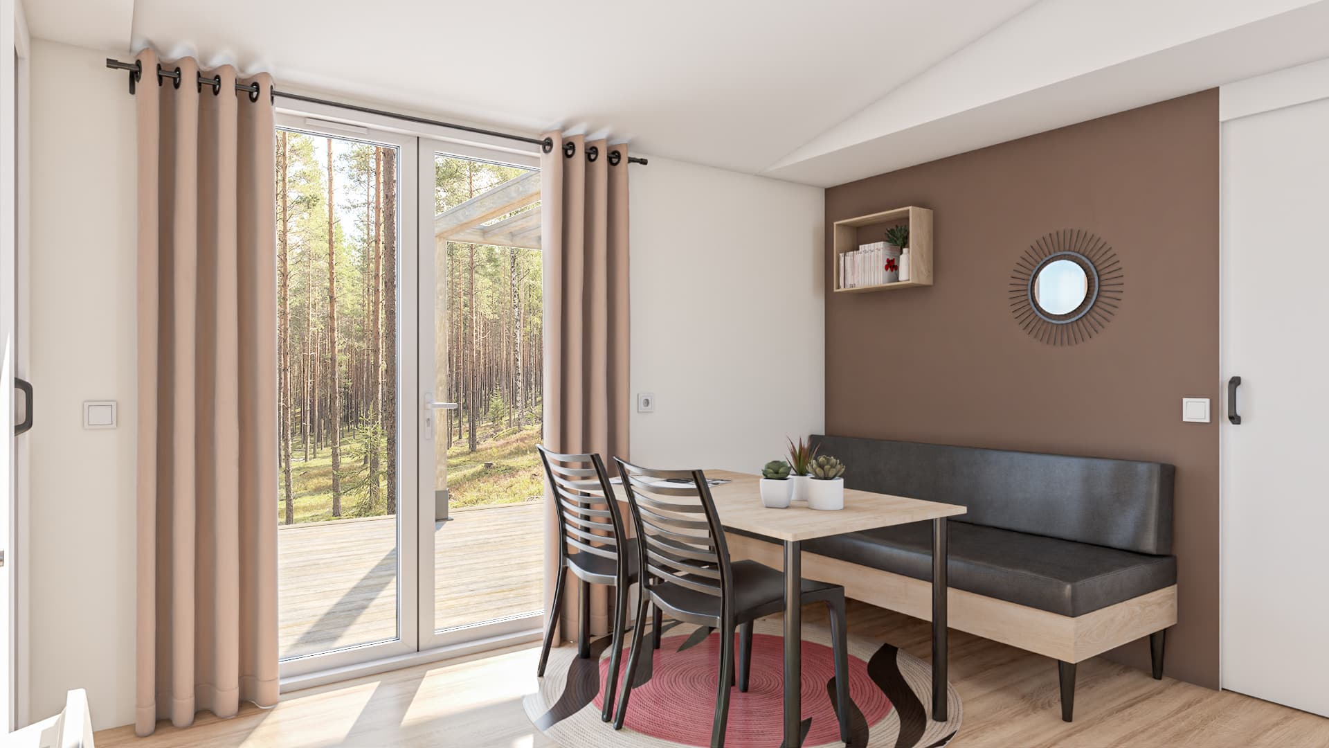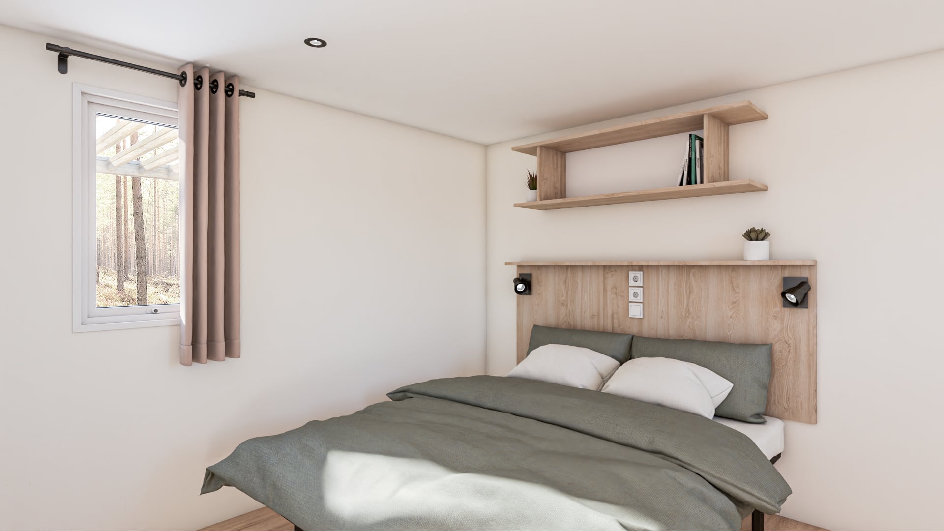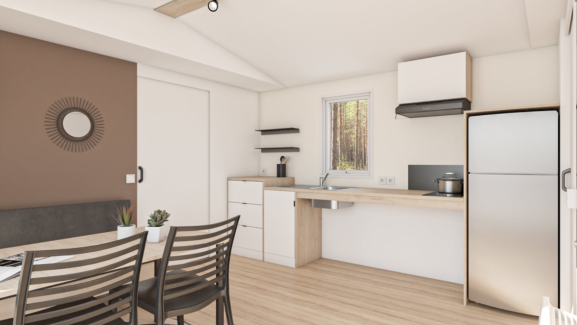 Le mobil-home Lagon dispose d’une grande pièce de vie pour accueillir toute la famille et amis. L’agencement fonctionnel et optimisé offre un espace cuisine-repas très pratique, un coin salon convivial et de nombreux rangements. L’espace nuit parents/enfants est séparé, pour plus d’intimité. Photographies tirées du site https://pro.residences-trigano.com.